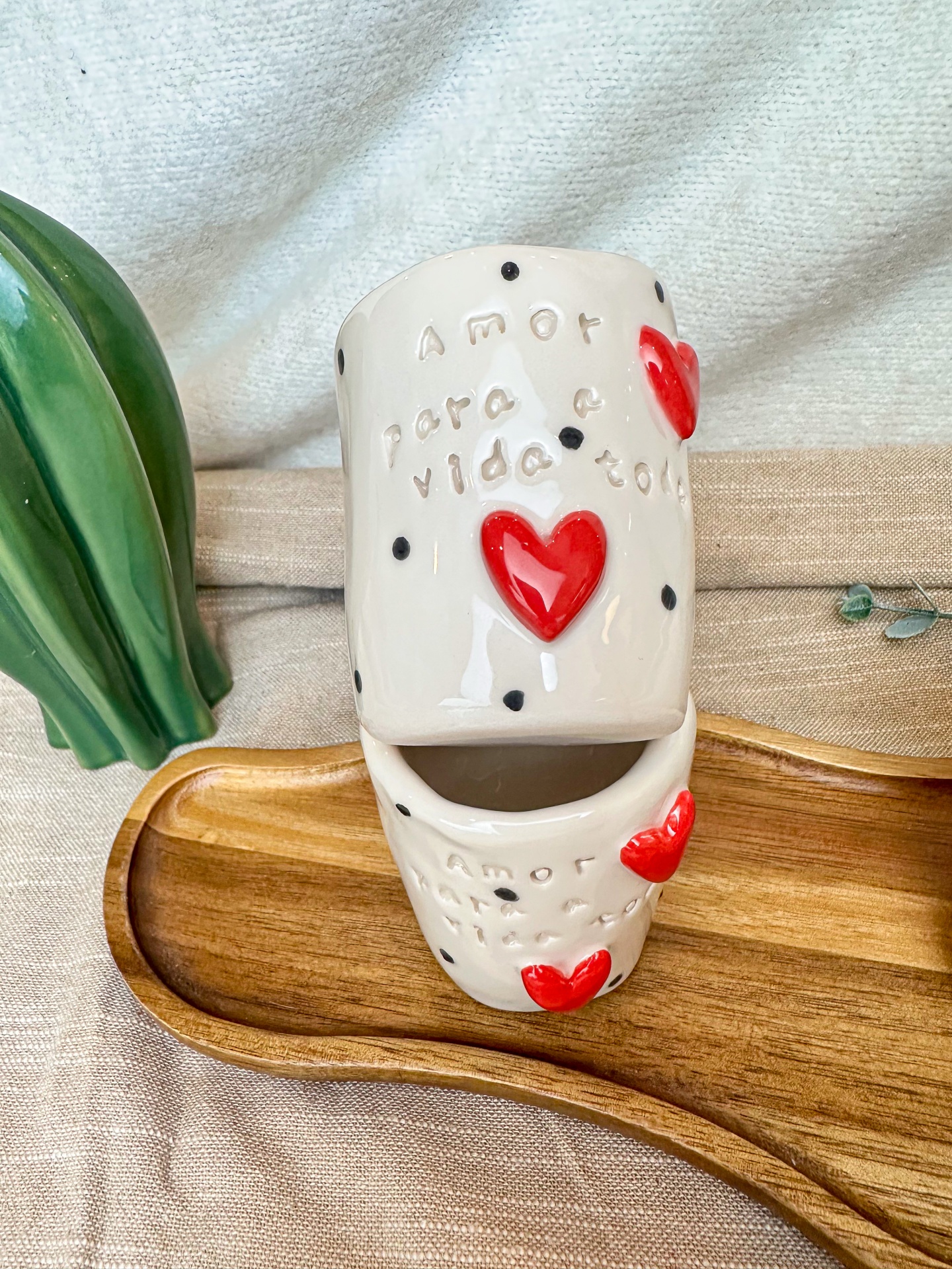 Com a mensagem “Amor para a vida toda” já gravada, dois corações pintados à mão e delicadas pintinhas pretas que tornam cada peça única, este copo é mais do que cerâmica. É intenção. É promessa. É carinho servido em cada café.